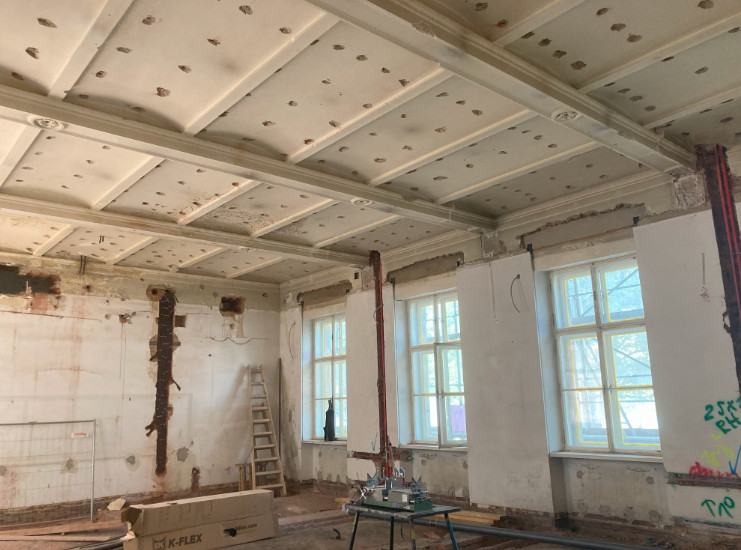 The spatial structure of the main building will be retained. Elements worthy of preservation will be refurbished, while additional partitions and doors will only be installed where necessary. The attic extension from 1985–89, built in solid construction, will be dismantled and replaced by a new roof structure. This will provide the required spatial configuration for teaching areas and correct the level discrepancies of the current roof zone.