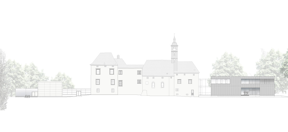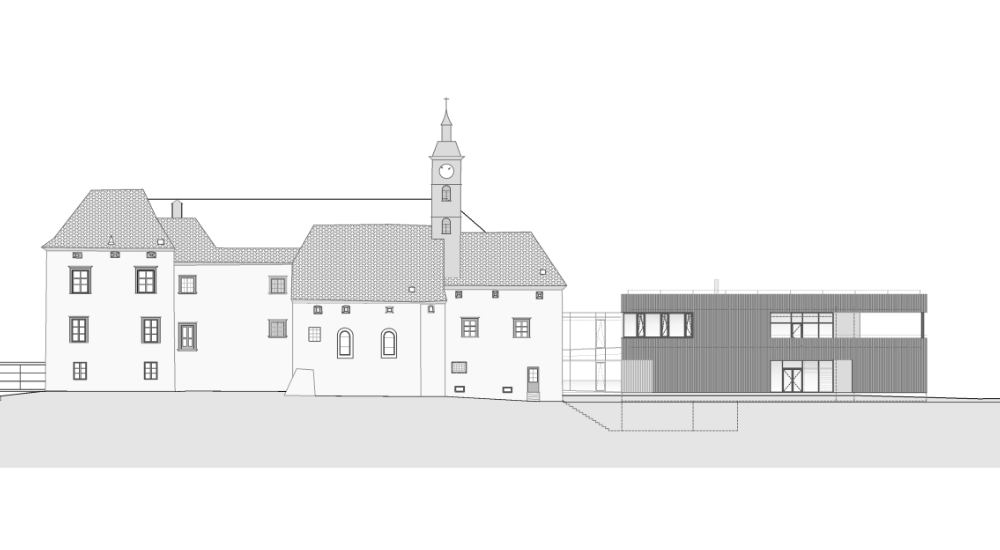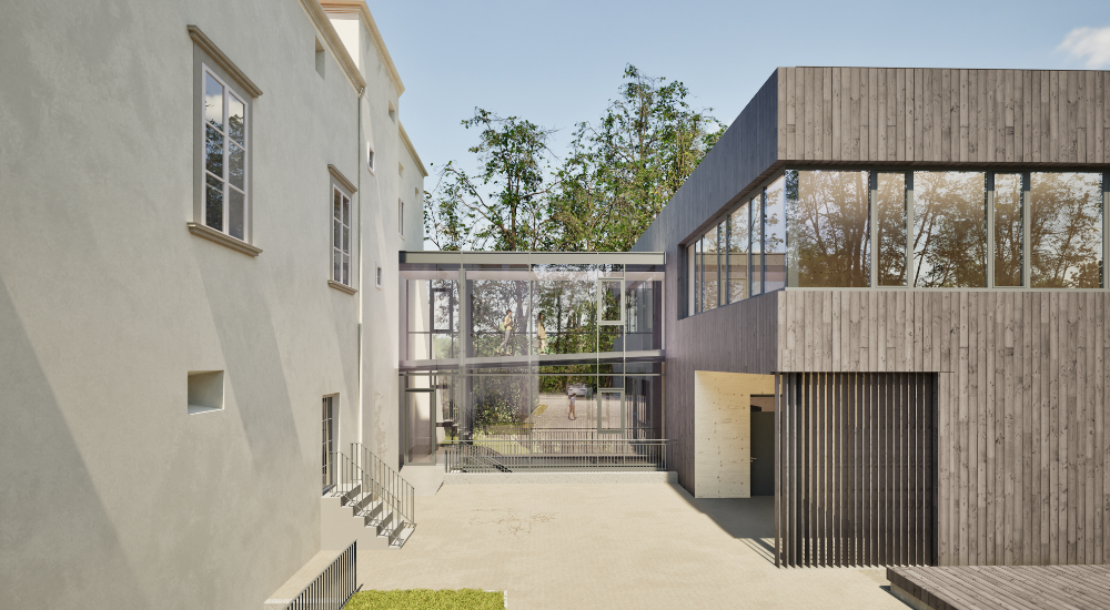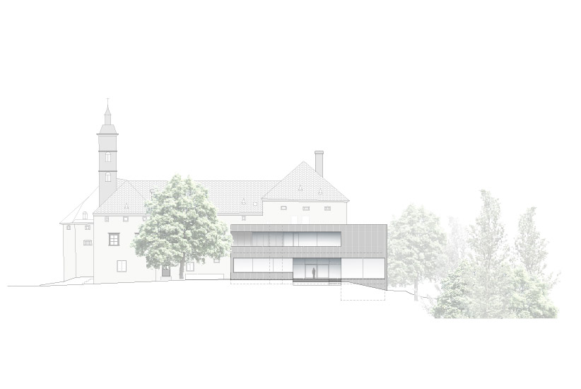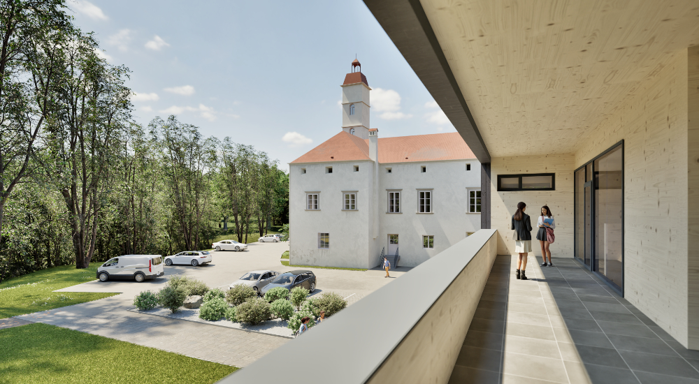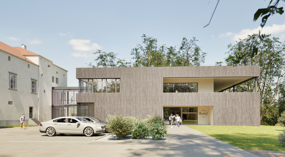 Die Fachschule Neudorf benötigt aufgrund der stark steigenden Schülerzahlen zusätzliche Unterrichtsräume für Praxis- und Theorieunterricht. Der geplante Zubau ergänzt das denkmalgeschützte Schloss harmonisch, ohne es zu imitieren. So schafft der Neubau auf der Ostseite des Schlosses ein architektonisches Gegengewicht zum bestehenden Turnsaal und integriert sich sensibel in die umgebende Parklandschaft. Durch das Abrücken vom Schloss entsteht ein Hofraum als Lade- und Manipulationszone sowie ein kleiner Vorplatz, der den neuen Gebäudeteil klar definiert. Der Neubau ist zweigeschossig und wird über eine zweigeschossige Brücke mit dem Schloss verbunden. Diese Verbindung ermöglicht es auf beiden Ebenen einen fließenden Übergang zwischen Theorie- und Praxisräumen herzustellen. Das zentrale Atrium bildet das räumliche Herzstück des Entwurfs – ein heller, offener Raum, der sich zum Park hin öffnet und vielfältige Ein-, Durch- und Ausblicke bietet. Es fungiert als Verteiler-, Aufenthalts- und Pausenraum und verleiht dem Neubau eine großzügige, kommunikative Atmosphäre – etwas, das im beengten Schloss bislang fehlte. Im Erdgeschoß liegen die praktischen Unterrichtsbereiche und der Speisesaal. Eine vorgelagerte Terrasse im Park erweitert den Speisesaal ins Freie. Weiters sind hier auch die Umkleiden, Lager, Sozialraum und Entsorgungsbereich funktional angeordnet. Im Obergeschoss werden, über eine Galerie im Atrium die Klassen- und Gruppenräume erschlossen. Eine überdachte Terrasse dient als Freiklasse und kann später als Erweiterungsfläche ausgebaut werden. So verbindet der Entwurf Funktionalität, Nachhaltigkeit und architektonische Klarheit. Der neue Baukörper tritt als zeitgemäße Ergänzung zum historischen Schloss auf, respektiert dessen Maßstäblichkeit und Struktur, schafft aber gleichzeitig lichtdurchflutete, offene Lernräume, die den Schulalltag räumlich und atmosphärisch deutlich aufwerten.