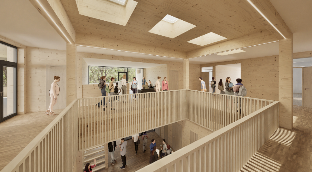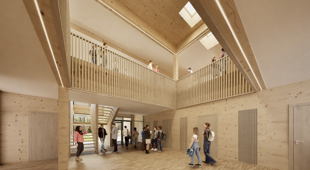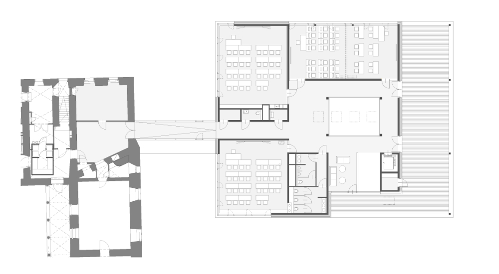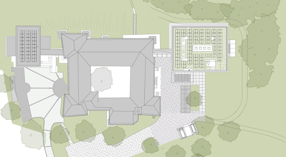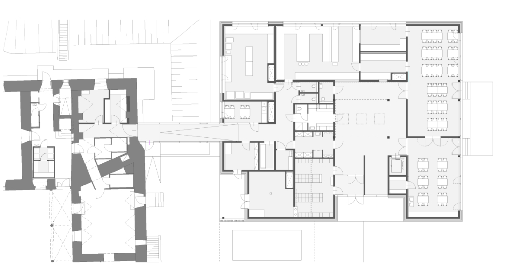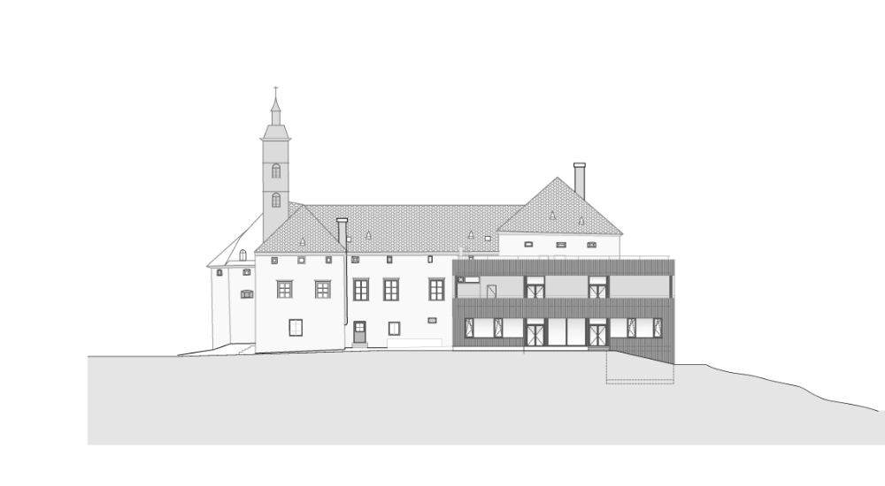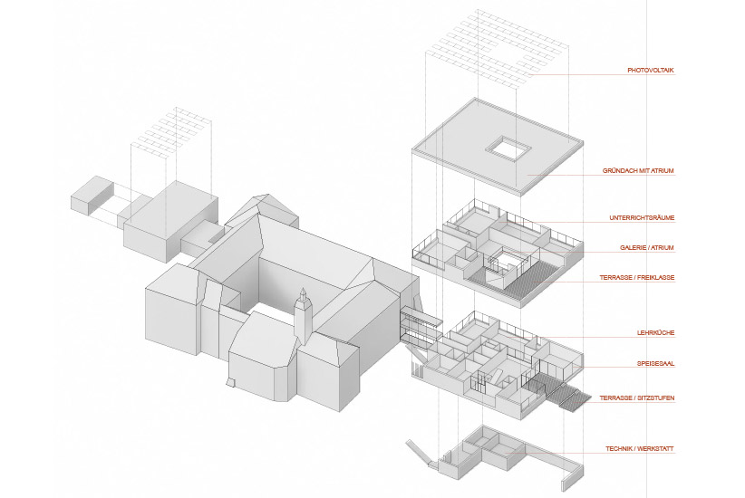 Die Fachschule Neudorf benötigt aufgrund der stark steigenden Schülerzahlen zusätzliche Unterrichtsräume für Praxis- und Theorieunterricht. Der geplante Zubau ergänzt das denkmalgeschützte Schloss harmonisch, ohne es zu imitieren. So schafft der Neubau auf der Ostseite des Schlosses ein architektonisches Gegengewicht zum bestehenden Turnsaal und integriert sich sensibel in die umgebende Parklandschaft. Durch das Abrücken vom Schloss entsteht ein Hofraum als Lade- und Manipulationszone sowie ein kleiner Vorplatz, der den neuen Gebäudeteil klar definiert. Der Neubau ist zweigeschossig und wird über eine zweigeschossige Brücke mit dem Schloss verbunden. Diese Verbindung ermöglicht es auf beiden Ebenen einen fließenden Übergang zwischen Theorie- und Praxisräumen herzustellen. Das zentrale Atrium bildet das räumliche Herzstück des Entwurfs – ein heller, offener Raum, der sich zum Park hin öffnet und vielfältige Ein-, Durch- und Ausblicke bietet. Es fungiert als Verteiler-, Aufenthalts- und Pausenraum und verleiht dem Neubau eine großzügige, kommunikative Atmosphäre – etwas, das im beengten Schloss bislang fehlte. Im Erdgeschoß liegen die praktischen Unterrichtsbereiche und der Speisesaal. Eine vorgelagerte Terrasse im Park erweitert den Speisesaal ins Freie. Weiters sind hier auch die Umkleiden, Lager, Sozialraum und Entsorgungsbereich funktional angeordnet. Im Obergeschoss werden, über eine Galerie im Atrium die Klassen- und Gruppenräume erschlossen. Eine überdachte Terrasse dient als Freiklasse und kann später als Erweiterungsfläche ausgebaut werden. So verbindet der Entwurf Funktionalität, Nachhaltigkeit und architektonische Klarheit. Der neue Baukörper tritt als zeitgemäße Ergänzung zum historischen Schloss auf, respektiert dessen Maßstäblichkeit und Struktur, schafft aber gleichzeitig lichtdurchflutete, offene Lernräume, die den Schulalltag räumlich und atmosphärisch deutlich aufwerten.